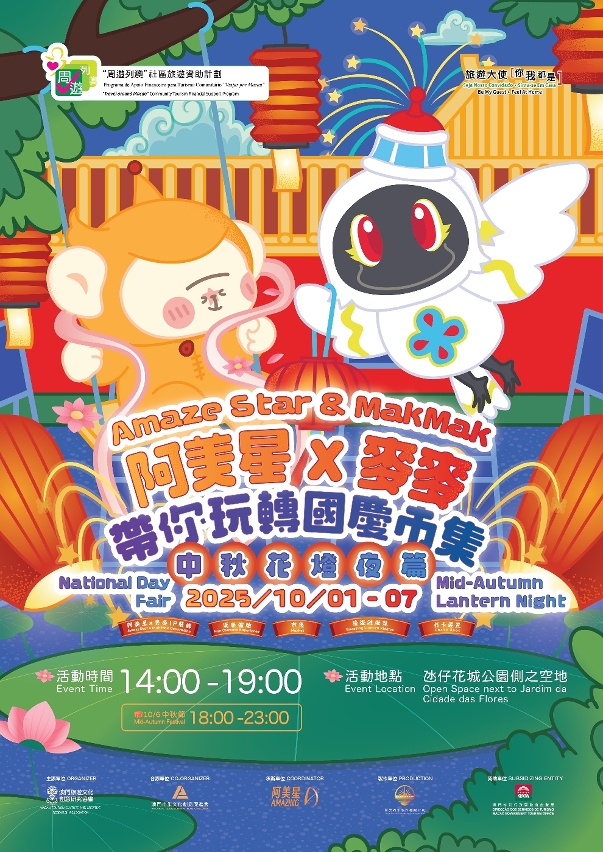 “2025阿美星x麥麥帶你玩轉國慶市集&中秋花燈夜篇”於10月1至7日在氹仔花城公園入口側舉行,帶來特色市集、街頭表演及打卡裝置等,晚上更化身為夢幻花燈夜景,洋溢節慶氣氛。