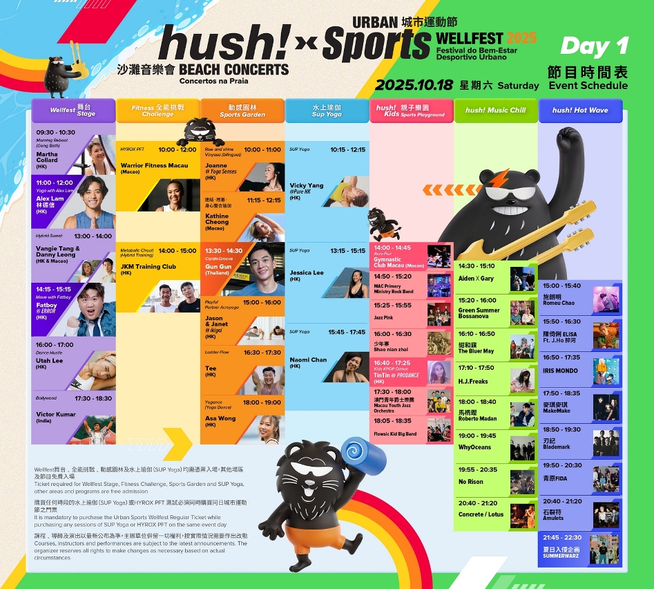 “hush! 沙灘音樂會 x 城市運動節”主活動將於10月18日及19日在黑沙海灘及黑沙臨時休憩空間舉行,設有“Hot Wave”、“Music Chill”、“hush! Kids親子樂園”、“Wellfest舞台”、“動感園林”及“全能挑戰”六大舞台,一連兩日從早到晚帶來馬拉松式的音樂演出和運動課程。現場更設有水上瑜伽、音樂劇親子巡遊、音樂螢光跑、藝術裝置、美食及文創市集、樂器體驗及工作坊等豐富周邊活動,回應市民及旅客的不同喜好和需要,共同感受澳門中西薈萃的文化特色,打造澳門作為中西文明交流互鑒的重要窗口。