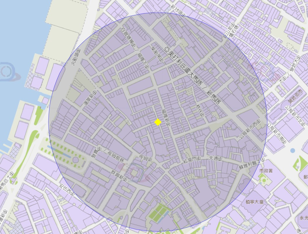 爹美刁施拿地大馬路(近新馬路一段)附近風險區域200米半徑範圍
