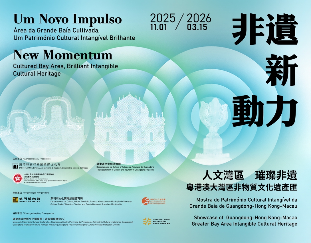 由廣東省文化和旅遊廳、香港特別行政區政府文化體育及旅遊局、澳門特別行政區政府文化局主辦,深圳市文化廣電旅遊體育局、香港康樂及文化事務署、澳門博物館承辦,廣東省非物質文化遺產館(省非遺保護中心)及香港非物質文化遺產辦事處協辦的“非遺新動力——人文灣區•璀璨非遺:粵港澳大灣區非物質文化遺產匯”將於2025年11月1日至2026年3月15日在澳門舉行,活動設有專題展覽、技藝互動展示、體驗工作坊及非遺文創產品銷售,11月1日至3日澳門博物館免費開放,歡迎公眾參與。
