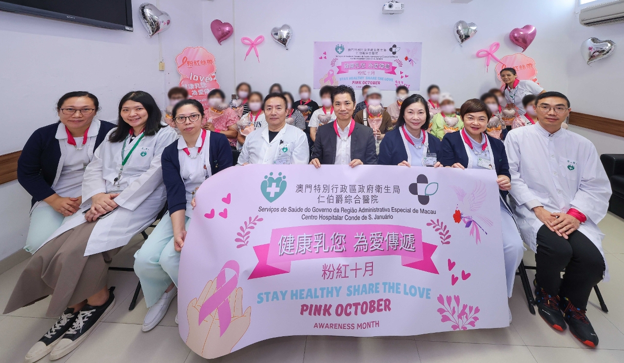 為響應每年十月的“國際乳癌關注月”(International Breast Cancer Awareness Month,又稱“粉紅十月”),衛生局仁伯爵綜合醫院日前舉辦以“健康乳您,為愛傳遞”為主題的專題講座,內容包括乳腺癌治療等,以提升患者及居民對乳癌防治的認知,鼓勵適齡女性定期接受篩查,以實現“早發現、早診斷、早治療”,是次講座包括患者及家屬等近30人出席。講座期間,醫院管理團隊與患者及家屬等一同佩戴粉色領巾,象徵全球乳癌防治的共同標誌——“粉紅絲帶”,展現醫患同心、攜手傳遞關愛與希望的信念。
