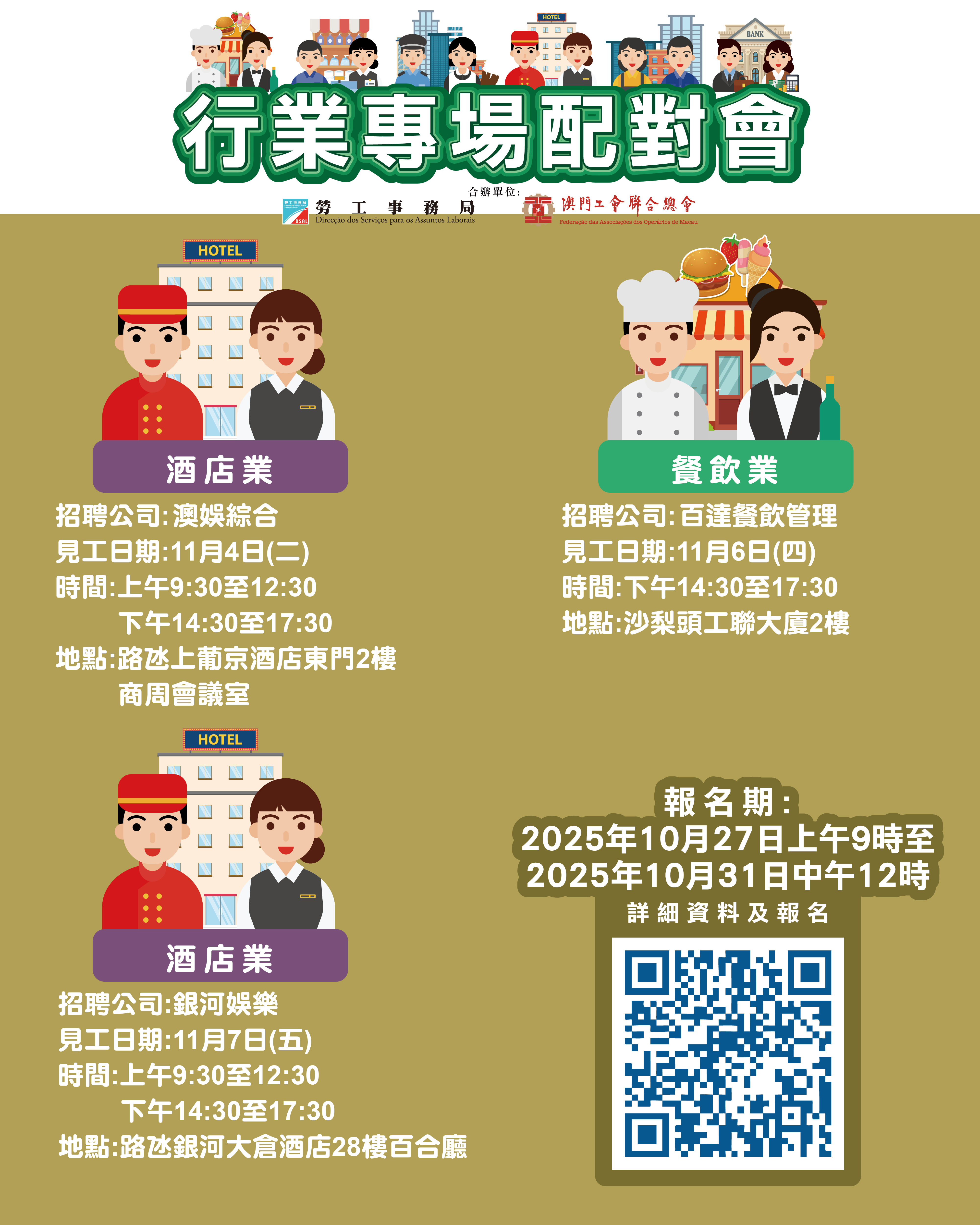為協助有求職需求的澳門居民盡快就業,以及為緩解業界的人資需求壓力,勞工事務局(下稱勞工局)與澳門工會聯合總會(下稱工聯)合作於11月上旬辦三場行業專場配對會,合共提供111個空缺。報名期由即日(10月27日)起至10月31日中午12時。