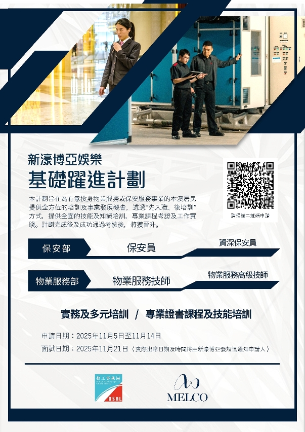為有意投身酒店物業服務或保安服務範疇的本澳居民,提供全方位的培訓及事業發展機會,勞工事務局(下稱“勞工局” )和新濠博亞娛樂有限公司(下稱“新濠博亞”)合作推出“新濠博亞娛樂基礎躍進計劃—物業服務及保安服務範疇”(下稱“計劃” ),以“先入職、後培訓”方式,為本澳居民提供事業發展機會,計劃由11月5日起接受申請。