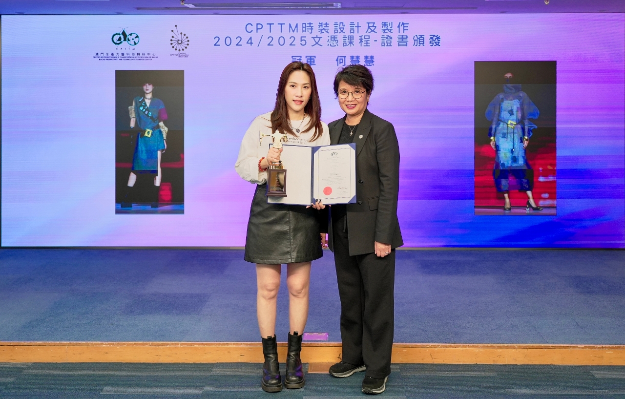 為持續促進澳門多元產業發展,澳門生產力暨科技轉移中心(下稱“生產力中心”)一直開辦“時裝設計及製作文憑課程”,致力為本地服裝業界培育設計新力量。本屆畢業表演已於早前順利舉行,由何慧慧的作品奪得冠軍。