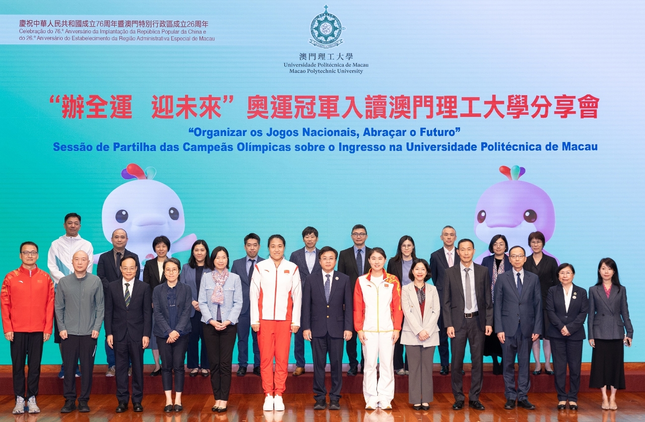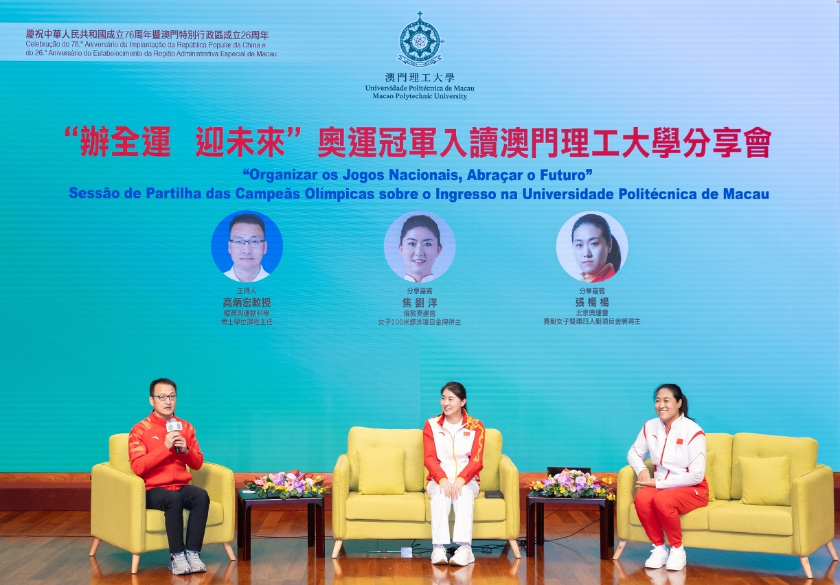 為慶祝中華人民共和國成立76周年暨澳門特別行政區成立26周年及第十五屆全國運動會舉辦之際,澳門理工大學舉辦“辦全運•迎未來—奧運冠軍入讀澳門理工大學分享會”。分享會以“與奧運冠軍共話體育精神,點燃青春力量”為主題,由澳門理工大學學生、奧運金牌得主焦劉洋及張楊楊主講,分享以體育為橋梁,助力粵港澳大灣區體育事業建設,激發青年群體以奮進姿態迎接“全運新時代”。澳理大行政管理委員會成員、學院院長、副院長、各單位主管,以及一眾師生三百多人出席聆聽,現場氣氛熱烈。