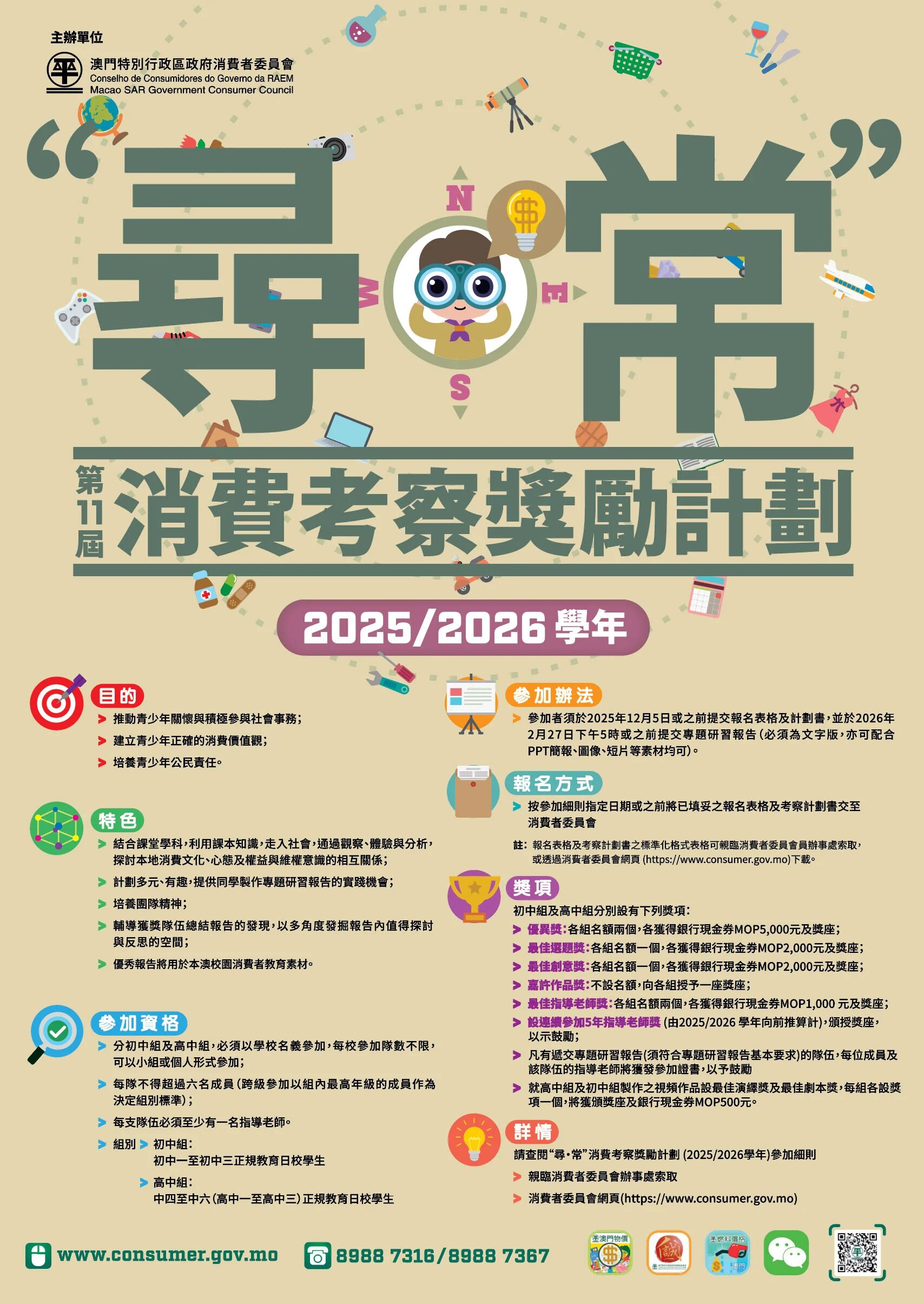 消費者委員會舉辦的第11屆“尋・常”消費考察獎勵計劃(下稱“尋・常”計劃)現正接受報名,報名截止日期至12月5日,歡迎全澳中學生組隊參加。