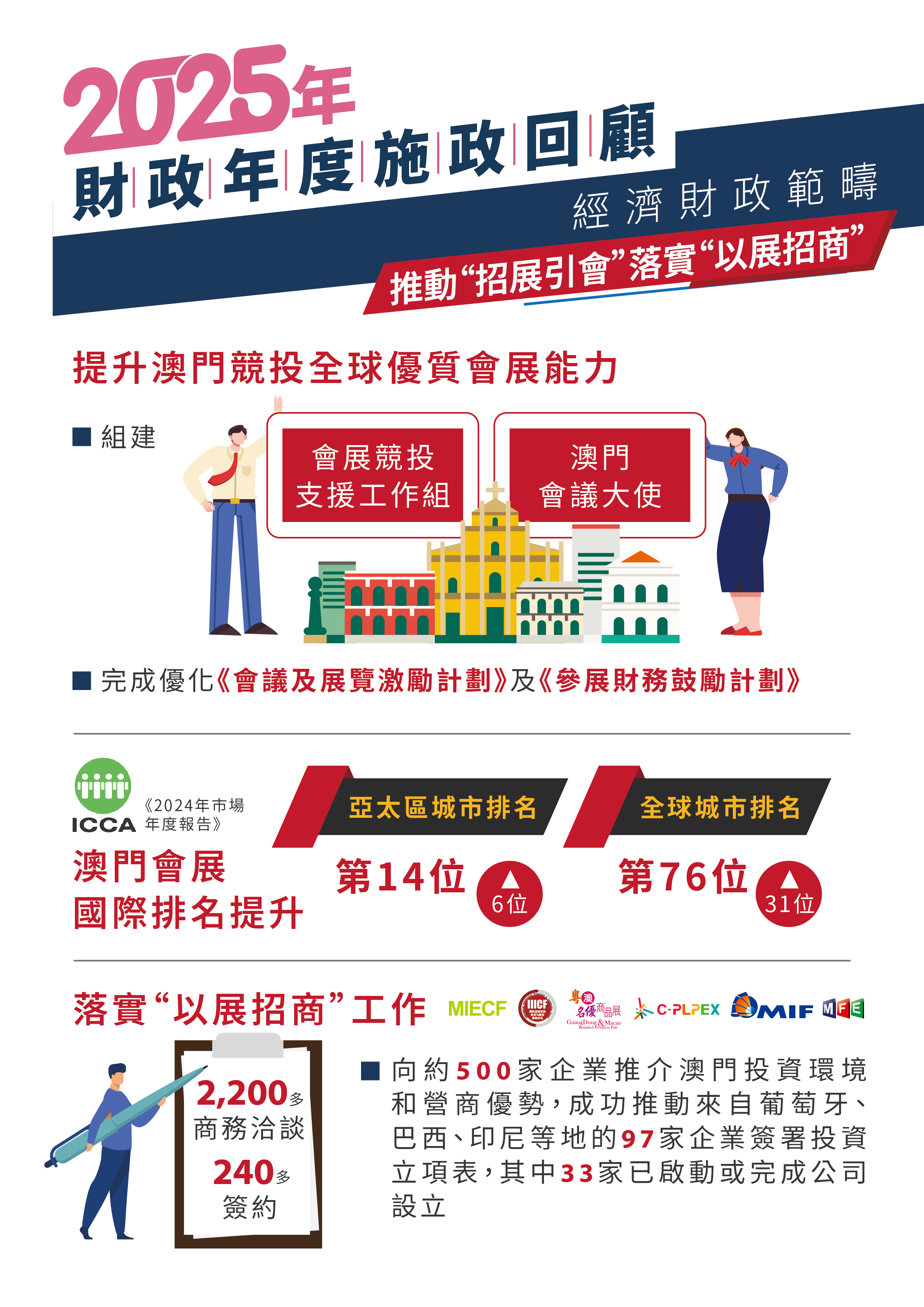 為落實2025施政報告提出加大招商引資力度,以及促進會展業市場化、專業化、國際化、數字化、綠色化發展的目標,招商投資促進局(下稱“招商局”)以“招商”和“會展”作為雙引擎,聚焦“首發@澳門”的建設,以多維度舉措加速重點產業優質資源聚集、強化國際會展平台功能,助力澳門引進新業態與創新服務,賦能重點產業發展。