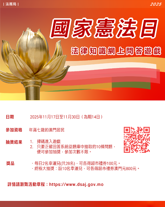 今年是第十二個“國家憲法日”,法務局於2025年11月17日至11月30日(為期14日)期間舉辦“國家憲法日”法律知識網上問答遊戲,透過寓學習於娛樂的遊戲方式,加強社會各界對《憲法》和《澳門基本法》的認識,歡迎本澳居民參加。