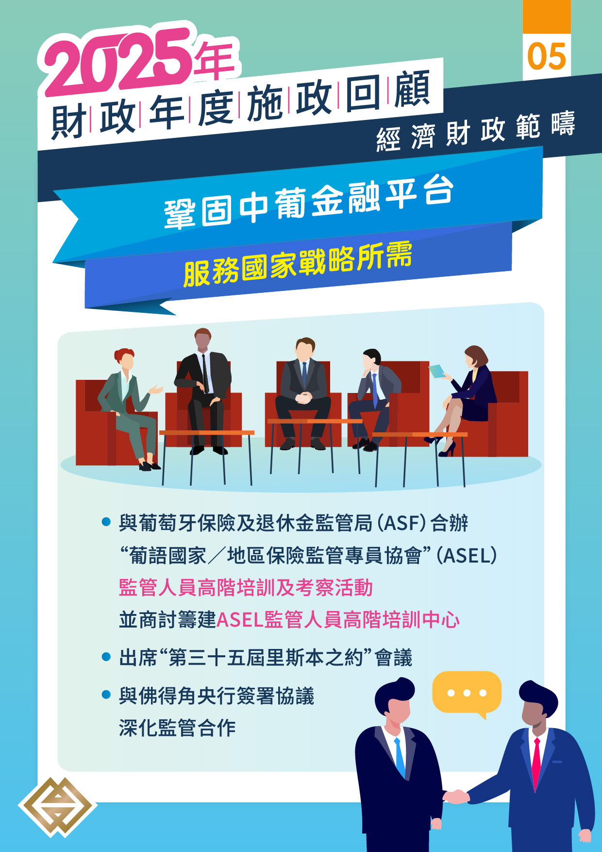 金管局於今年5月與葡萄牙保險及退休金監管局(下稱“ASF”)合辦“葡語國家/地區保險監管專員協會”(下稱“ASEL”)監管人員高階培訓及考察活動;10月,赴佛得角出席“第十二屆葡語國家中央銀行行長會議”,並與佛得角央行簽署《關於監管事務的合作協定》,深化雙邊金融監管合作。此外,金管局亦出席在葡萄牙里斯本舉行的“第三十五屆里斯本之約”會議,並與ASF商討簽訂合作協議,籌建ASEL監管人員高階培訓中心,在澳門打造中葡金融人才培訓基地。