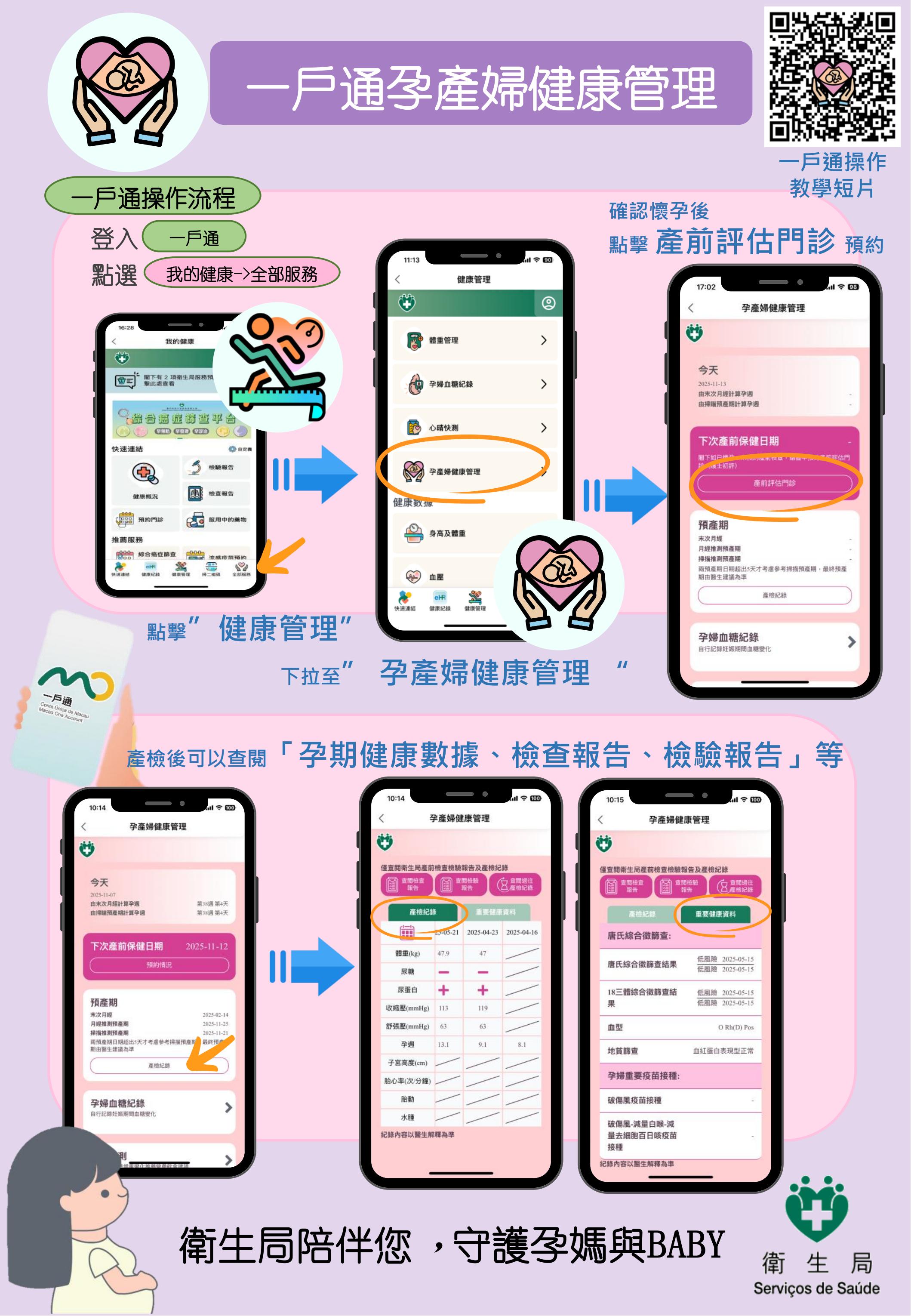 為貫徹特區政府構建生育友善環境的施政方針,優化資源配置,衛生局自今(22)日起在“一戶通”內推出孕產婦健康管理平台,為孕產婦提供一站式全孕周期的綜合健康管理服務。該健康管理平台涵蓋以下5大重點內容: