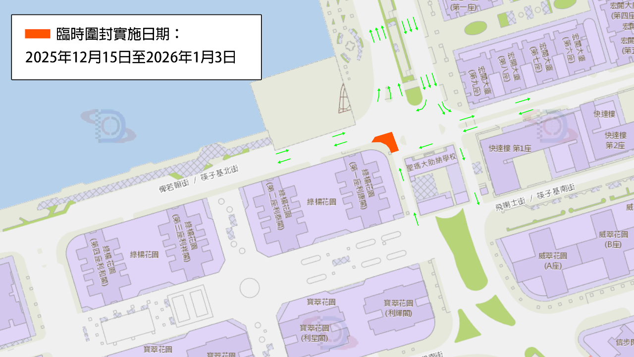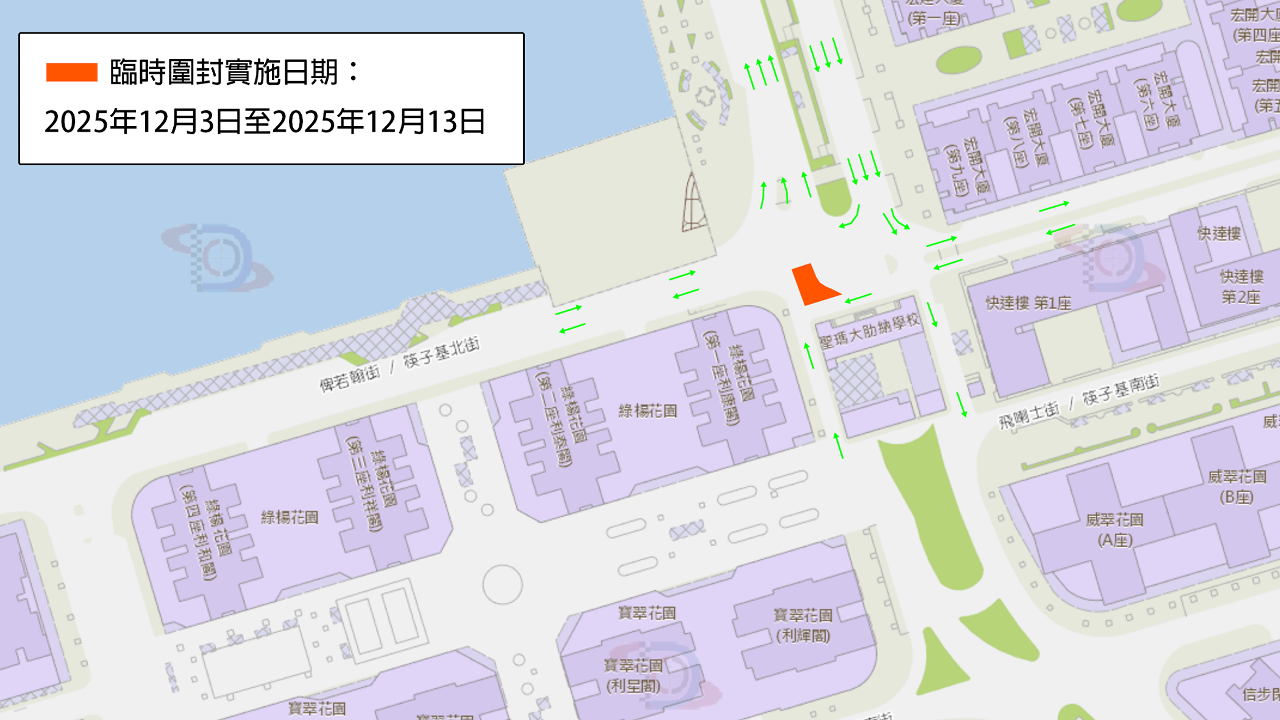 配合施工需要,聖瑪大肋納學校附近的俾若翰街路面將於2025年12月3日至2026年1月15日分階段實施有限度通車(具體安排見附圖)。公共建設局和交通事務局將定期檢視有關路段的交通狀況,適時公佈後續階段的具體臨時交通和巴士安排,亦會嚴格監督工程質量及進度,着力做好協調工作,減少工程對交通和道路使用者的影響。
