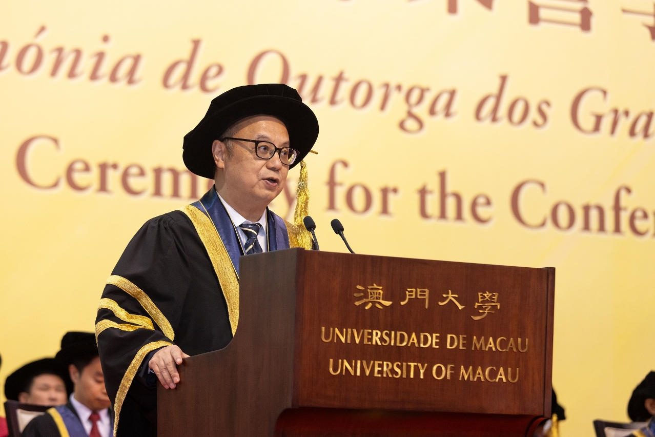 宋永華表示,澳大進入了一個更快、更好的全新發展階段,這與國家及特區政府的大力支持密不可分。去年國家主席習近平視察澳門時特別勉勵澳門青年要“心繫澳門、心繫國家,志存高遠、腳踏實地,當好‘一國兩制’事業的建設者和接班人”。他的殷切囑託不僅為澳大發展指明了方向,也激勵大家更好地肩負起時代使命,在“國家所需、澳門所長”中作出“澳大所為”,為澳門經濟社會高質量發展和教育強國、科技強國建設貢獻澳大力量。面對當今世界風雲激蕩,宋校長以三點期望寄語畢業生:第一,善於駕馭科技與人文的變革浪潮;第二,敢於應對逆境與挑戰的錘煉洗禮;第三,勇於肩負民族與國家的時代重任。