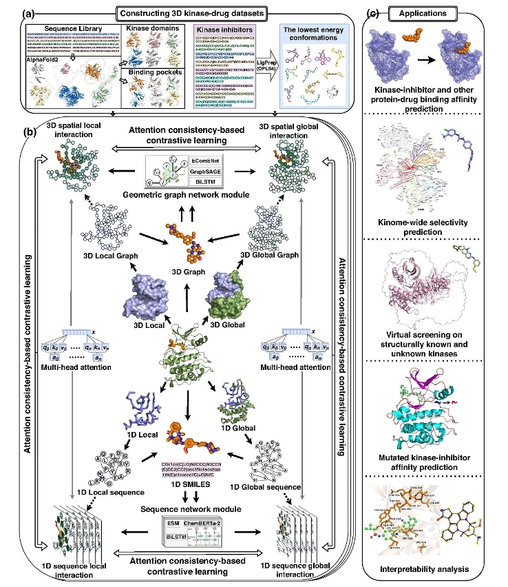 蛋白激酶作為細胞訊號傳導的關鍵調控分子,是當代最具潛力的藥物靶標之一。由於激酶結構的高度保守性及實驗成本高昂,開發具高選擇性的激酶抑制劑一直面臨挑戰。研究團隊針對此難題,開發出“MMCLKin”框架,透過結合幾何圖網絡與序列網絡,輔以多頭注意力機制與多模態、多尺度對比學習,顯著提升對激酶—藥物間活性與選擇性的預測能力。