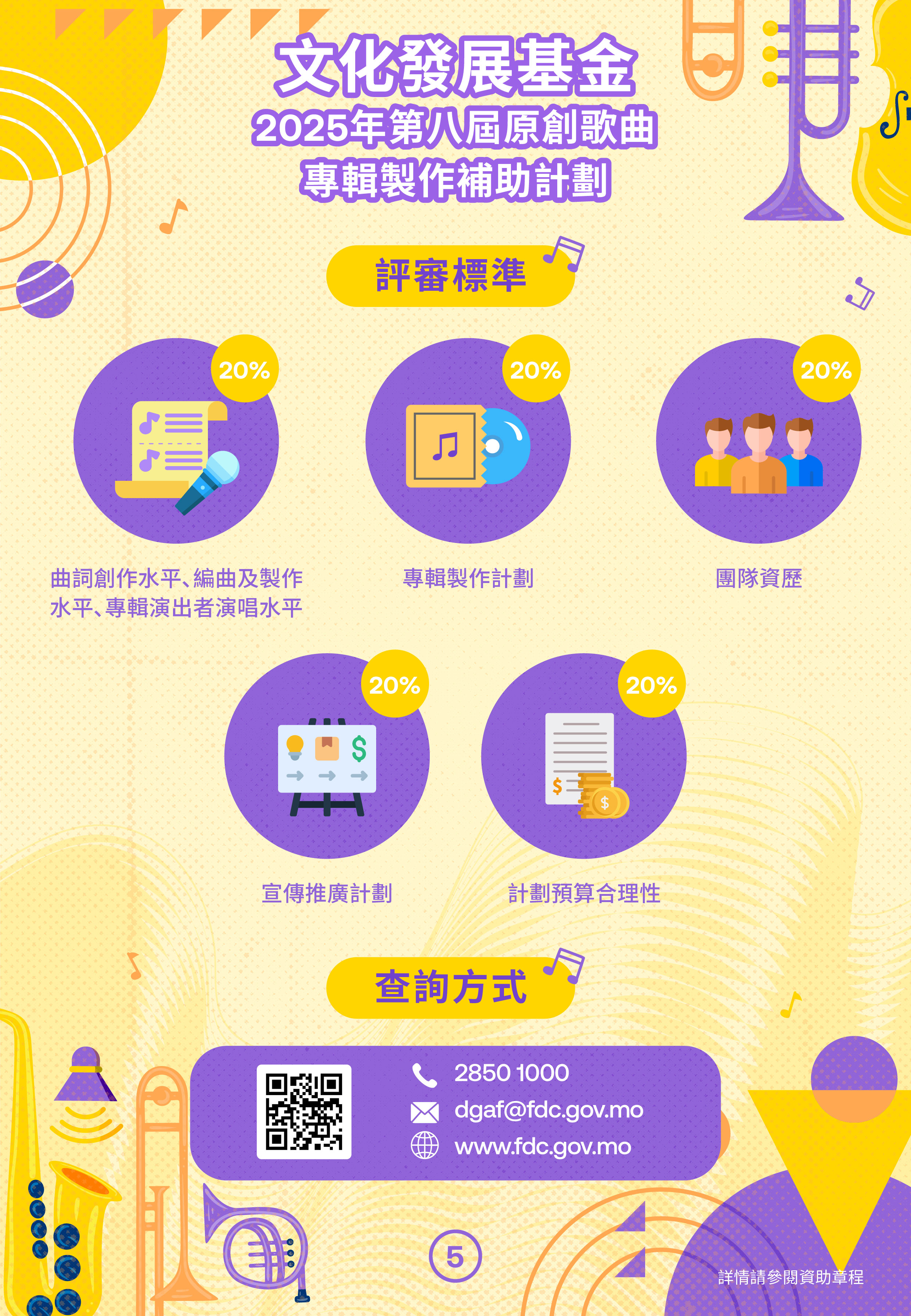 文化發展基金推出“第八屆原創歌曲專輯製作補助計劃”,培育本地音樂人才,推動澳門音樂產業發展,為創作者提供發表原創歌曲的機會,並透過資助製作、設計、發行及宣傳,以及專業意見支援,助力累積優秀作品,拓展市場。