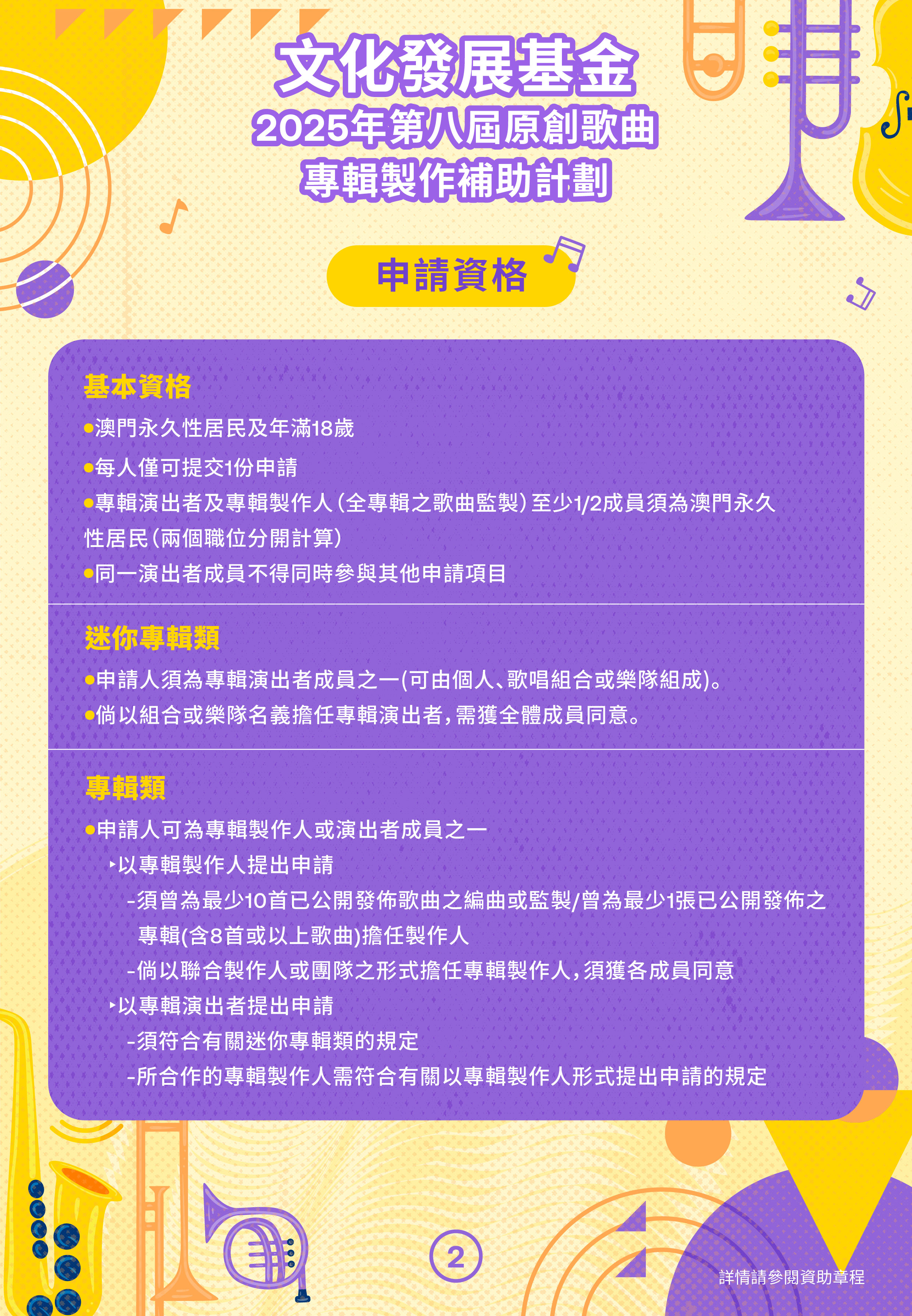 “第八屆原創歌曲專輯製作補助計劃”申請期由2025年12月31日至2026年2月13日。資助類型分為“迷你專輯”及“專輯”兩類,不包括合輯及精選輯。所有歌曲須為未曾發表及演出的原創、非委約作品。“迷你專輯”須包含至少3首歌曲,“專輯”則須至少6首。受資助專輯必須於最少4個商業數位音樂平台發行,其中至少1個須為內地平台,並需參與至少1次線下公開演唱,演出受資助專輯內至少1首歌曲。每一申請人僅限申請製作一張迷你專輯或一張專輯。