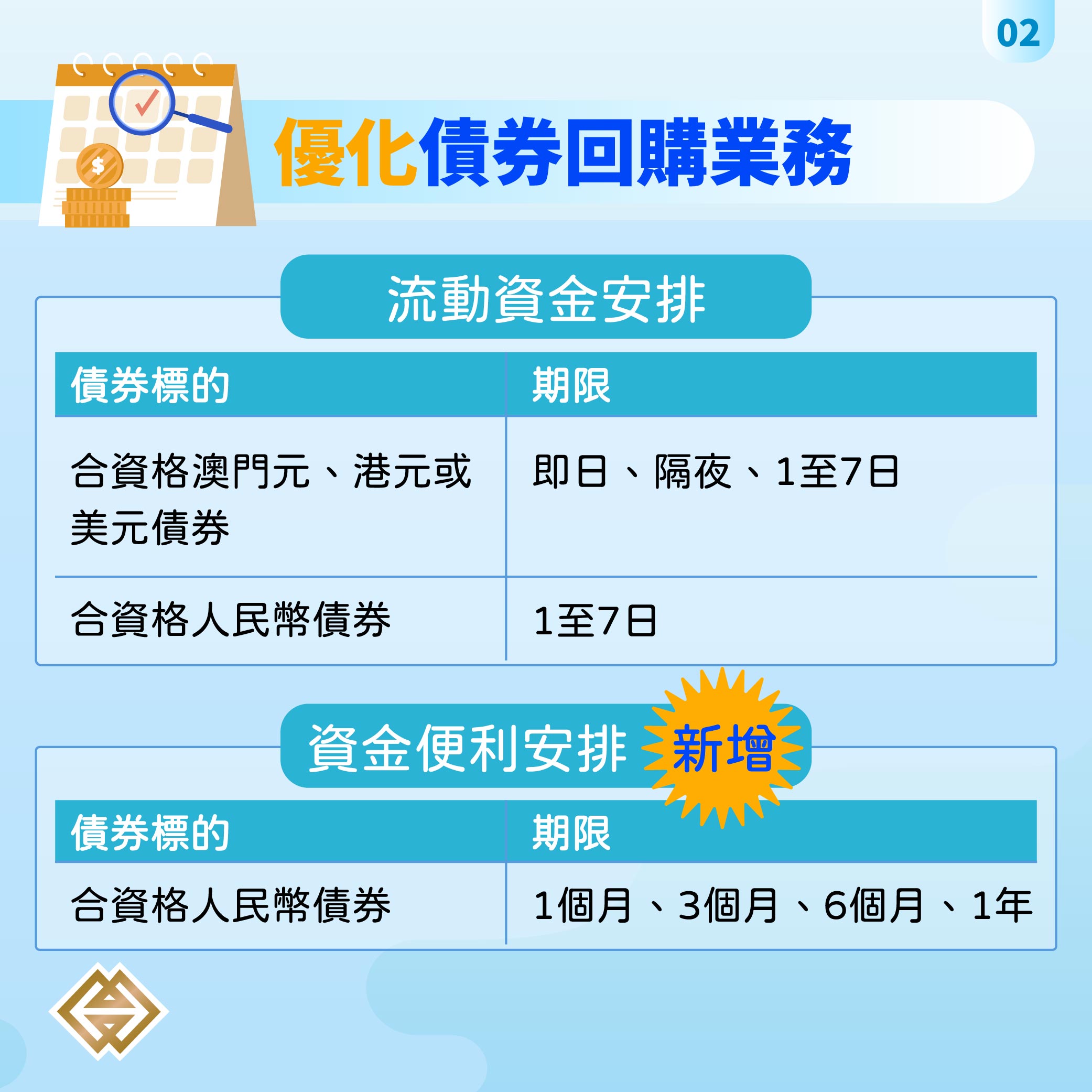 金管局於2023年初推出債券回購業務,以合資格債券作為回購標的,向本地銀行提供澳門元和人民幣的流動資金。為支持本地貨幣市場及債券市場發展,債券回購業務於即日起新增較長期限的“人民幣資金便利安排”;與此同時,本地銀行可利用澳門“中央證券託管系統”(CSD)與香港“債務工具中央結算系統”(CMU)直接聯網機制下的合資格債券進行回購業務,進一步發揮兩地聯動和協同發展效應。