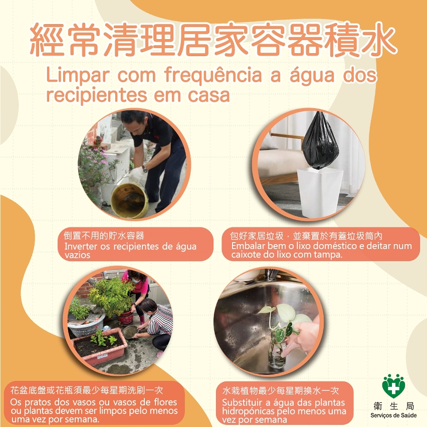 • 白紋伊蚊的卵和幼蟲主要藏匿在各種容器積水,應持續注意定期清除工作地點和家居周圍環境的積水,杜絕蚊蟲孳生。