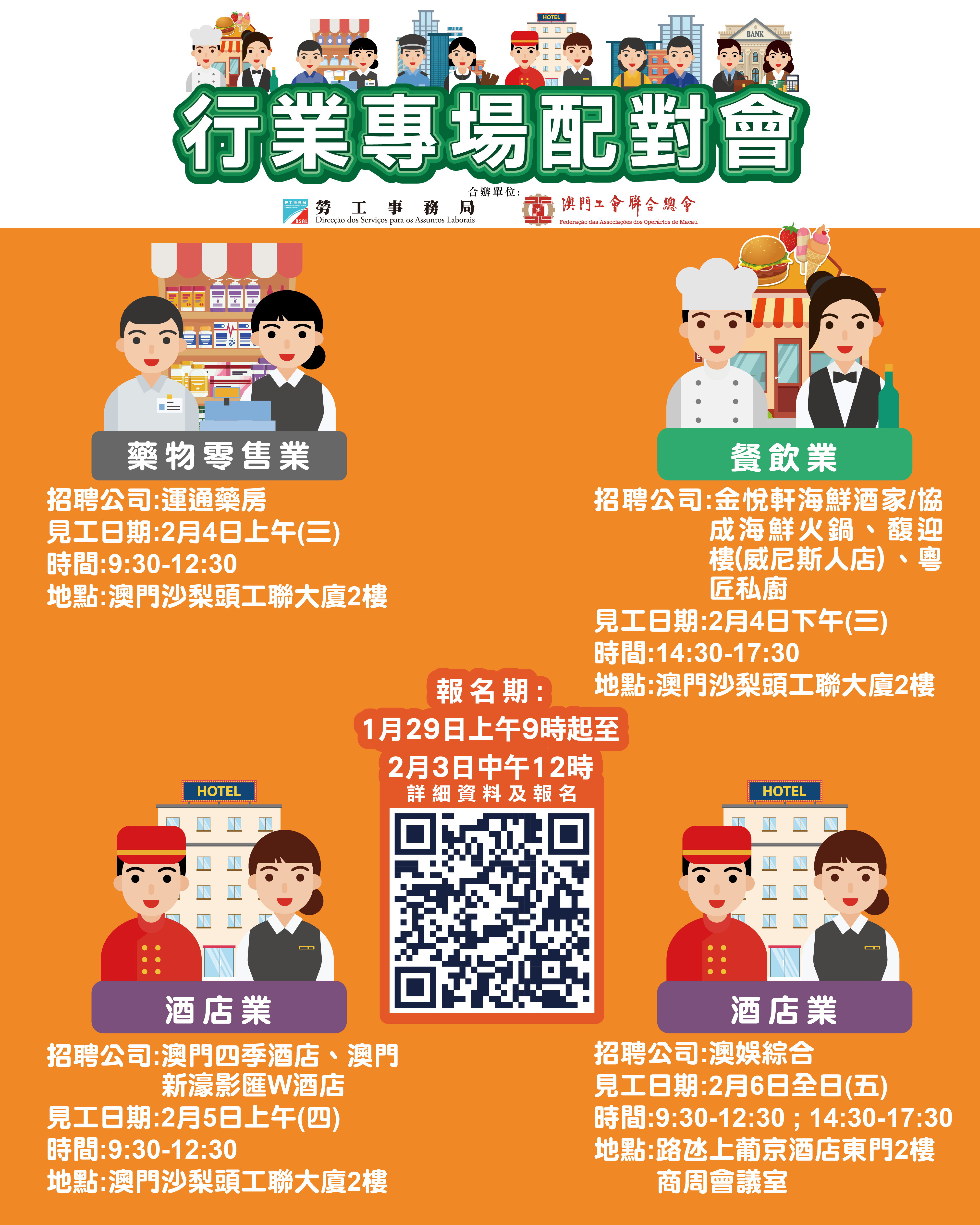 2月4日上午藥物零售業專場配對會、2月4日下午餐飲業專場配對會及2月5日上午酒店業專場配對會均在澳門沙梨頭海邊街2-6號工聯大廈二樓舉行;2月6日全日酒店業專場配對會在澳門上葡京酒店二樓商周會議室舉行。報名日期均由明(29)日上午9時起至2月3日中午12時。
