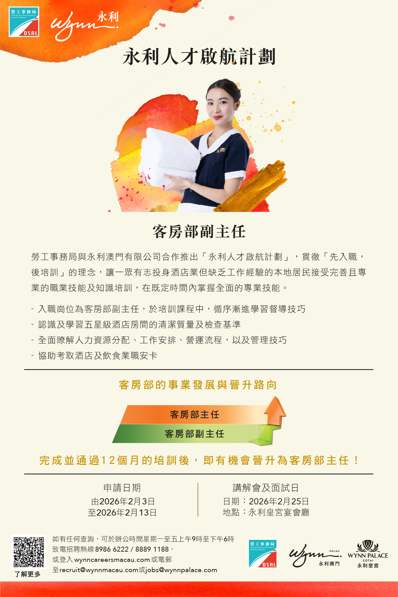 該計劃提供合共18個職位空缺,包括6個“客房部副主任"職位空缺、6個“公眾衛生部副主任"職位空缺及6個“洗衣部副主任"職位空缺。永利將向獲錄取的參加者,安排12個月的專業培訓及工作實踐。培訓內容包括專業行為準則及規範、相關部門營運實務知識、超凡主管技能訓練班,及安排考取澳門職業技能認可基準(MORS)等。