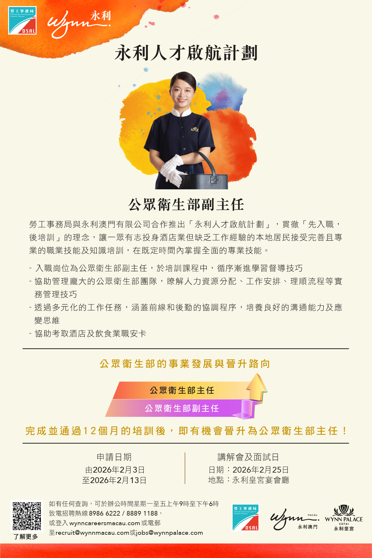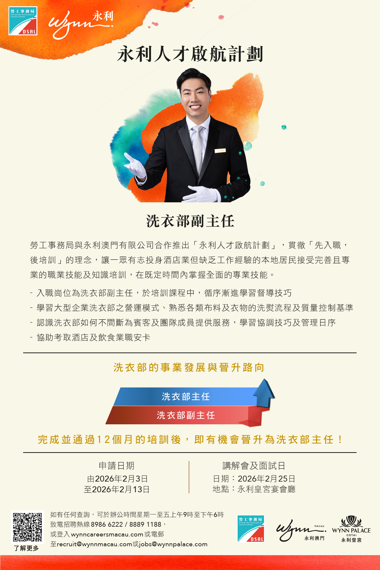 澳門居民如欲了解計劃詳情,可登入勞工局網站內相關專頁:https://www.dsal.gov.mo/zh_tw/standard/wynn2026_careerdevelopment_programme1.html,有意參加者可於明(3)日起至2月13日期間網上遞交申請。申請期結束後,永利將陸續通知符合條件的申請人,參加2月25日舉行的講座,隨即安排面試,詳細說明計劃的各項培訓內容及職業生涯發展路徑。