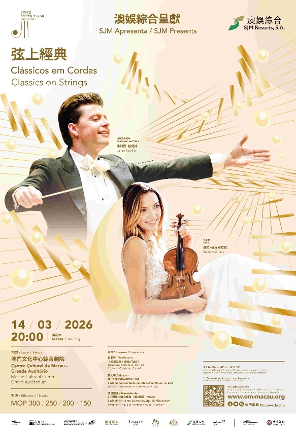 文化局、澳門樂團有限公司與澳娛綜合度假股份有限公司將於3月14日(周六)晚上8時,在澳門文化中心綜合劇院攜手呈獻《弦上經典》音樂會。國際著名小提琴家朱利安‧拉克林將同時擔任指揮,並聯袂中提琴家莎拉‧麥克爾拉維與澳門樂團,演出貝多芬《科里奧蘭》序曲、莫扎特《降E大調交響協奏曲》及孟德爾遜A小調第三號交響曲《蘇格蘭》,共同獻上一場旋律優美動人的弦樂盛宴。