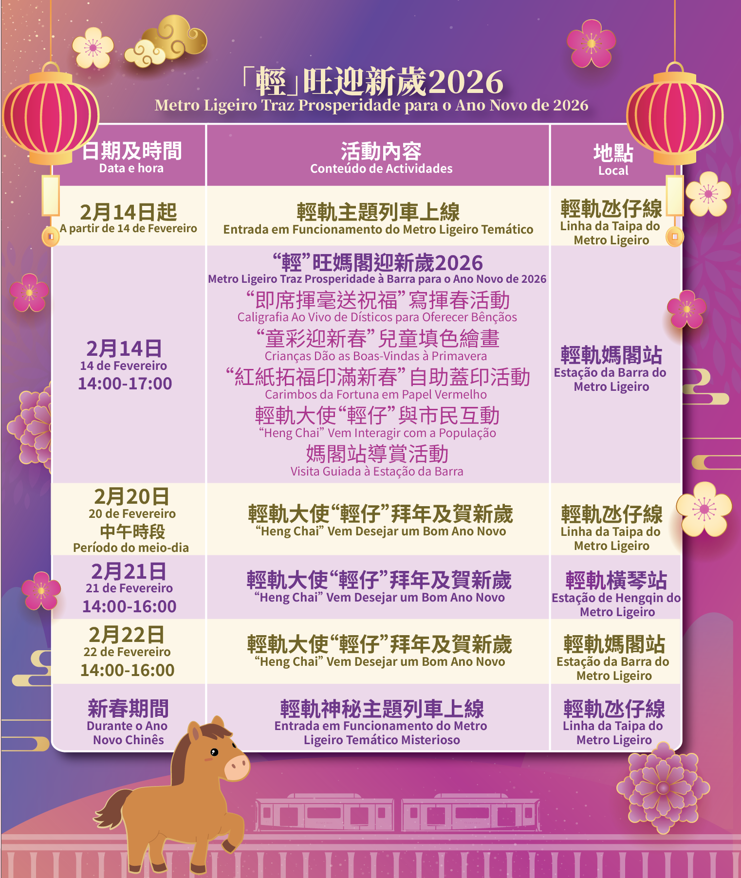 新春將至,澳門輕軌股份有限公司(下稱「輕軌公司」)特別推出「輕」旺迎新歲2026系列活動,與市民及旅客共賀佳節。除了在新春期間推出主題列車增添節日色彩外,輕軌公司也將於2月14日(年廿七)在輕軌媽閣站舉辦「『輕』旺媽閣迎新歲」活動,現場將免費贈送賀年揮春,並提供自助印製利是封等互動體驗,與市民及旅客一同提前感受新年氣氛。