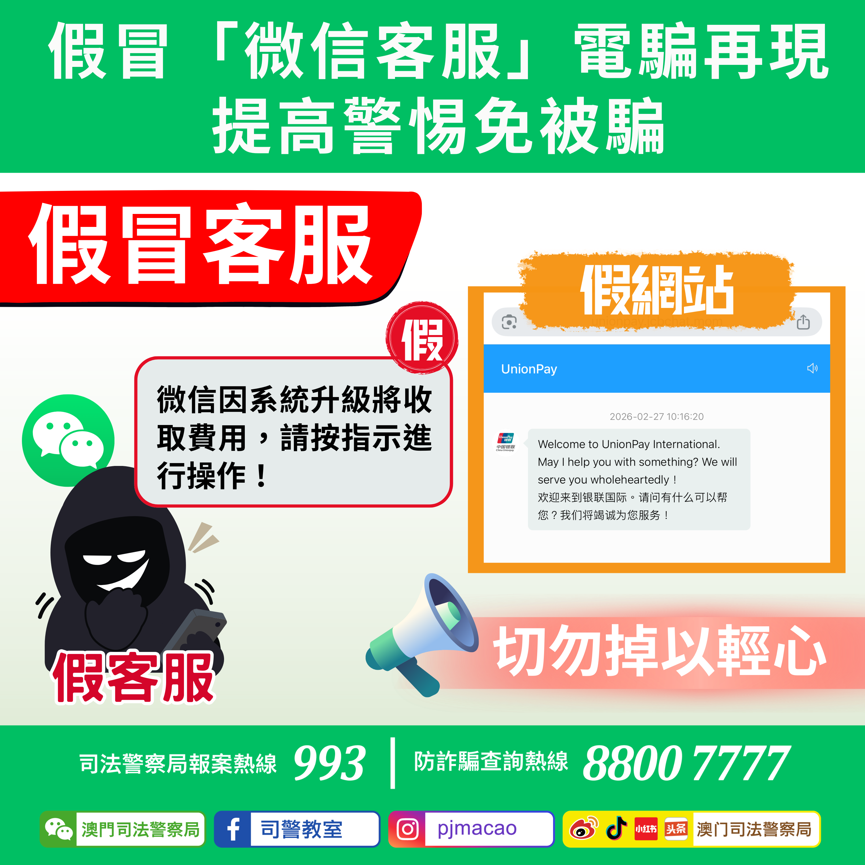 司法警察局今日(2月27日)接獲市民舉報,指接獲假冒「微信客服」的詐騙電話。騙徒在通話中聲稱,事主於開通微信帳號時,已同時啟用「支付及匯率相關服務」,並訛稱現因系統升級將開始收取費用。如事主欲取消服務,需按照「客服」指示進行操作。