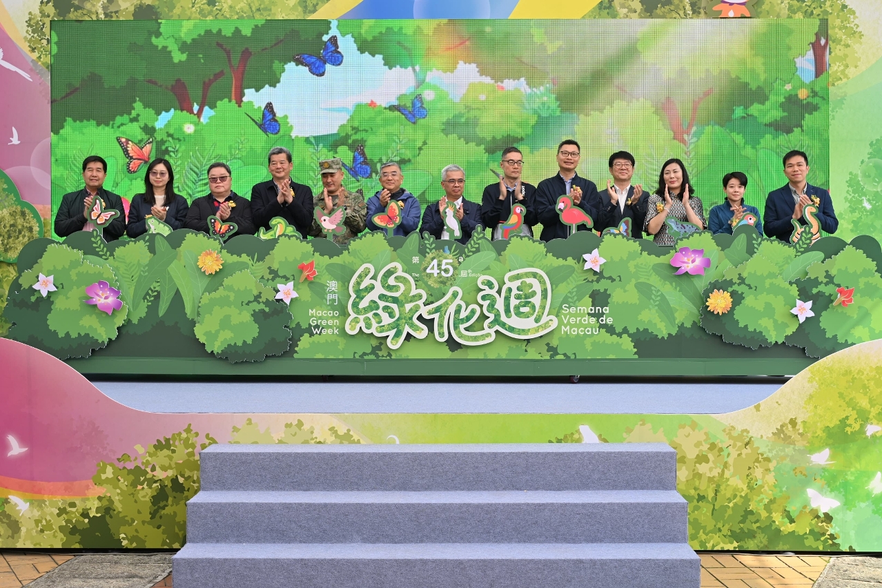 由市政署主辦的第45屆綠化週今(7)日在石排灣郊野公園揭開序幕,行政法務司司長黃少澤、中央政府駐澳門聯絡辦公室機關工作部部長杜偉民、外交部駐澳特派員公署副特派員程雷、解放軍駐澳部隊參謀長邵春貴、市政署市政管理委員會主席周偉迎等嘉賓主禮。