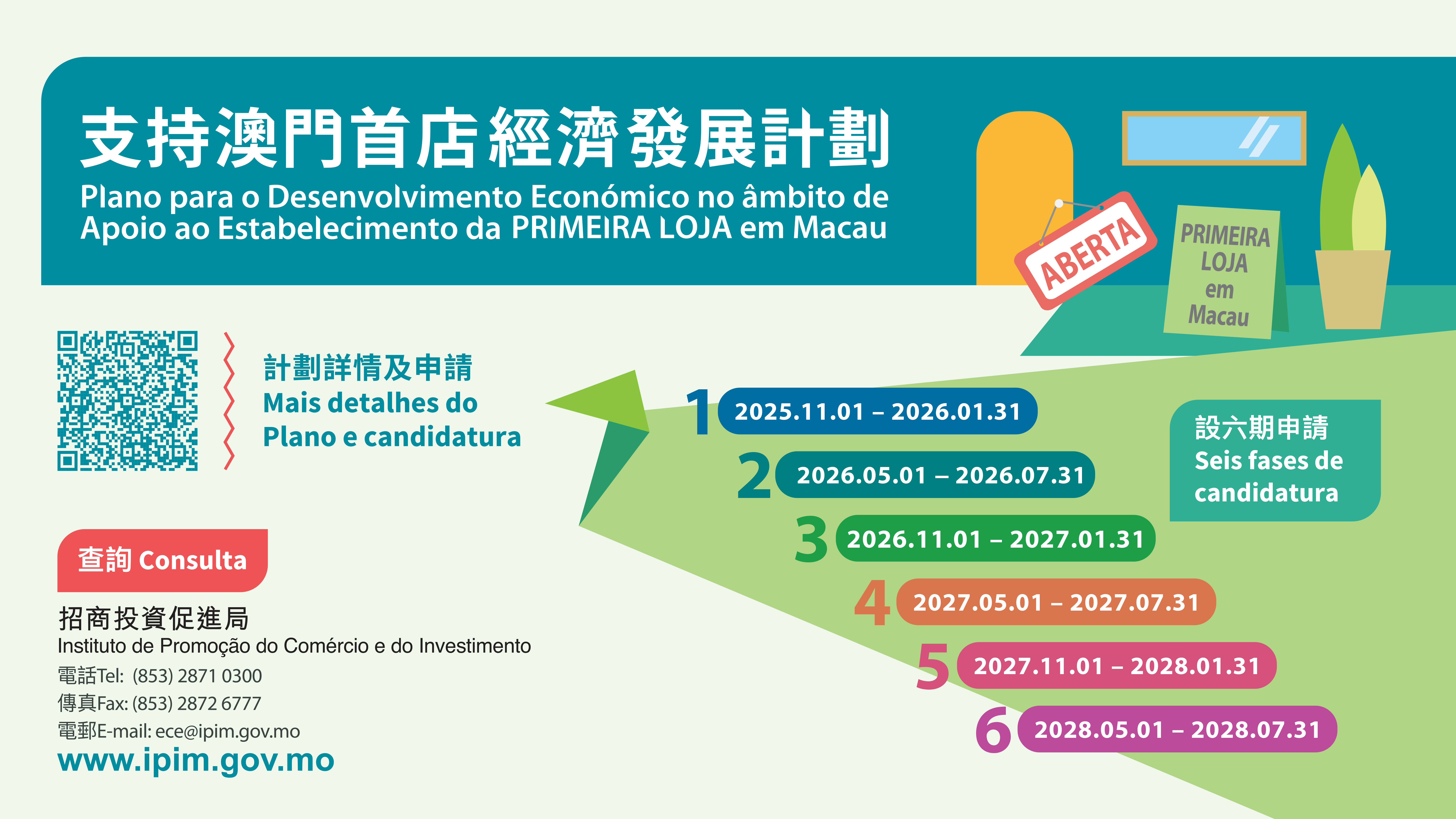 第二期“首店經濟計劃”將於2026年5月1日至7月31日接受申請,歡迎符合資格企業申請。詳情可瀏覽澳門招商局網站(https://www.ipim.gov.mo/)或掃描宣傳海報二維碼,亦可於辦公時間致電(853)2871 0300或電郵至ece@ipim.gov.mo向澳門招商局查詢。