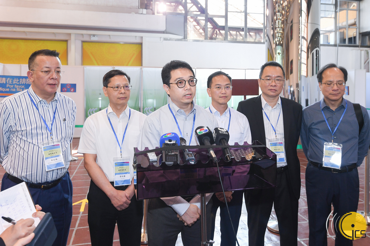 • The Chairman of the Electoral Affairs Commission for the Legislative Assembly Election, Mr Tong Hio Fong, speaks to reporters after reviewing preparation at the polling station.