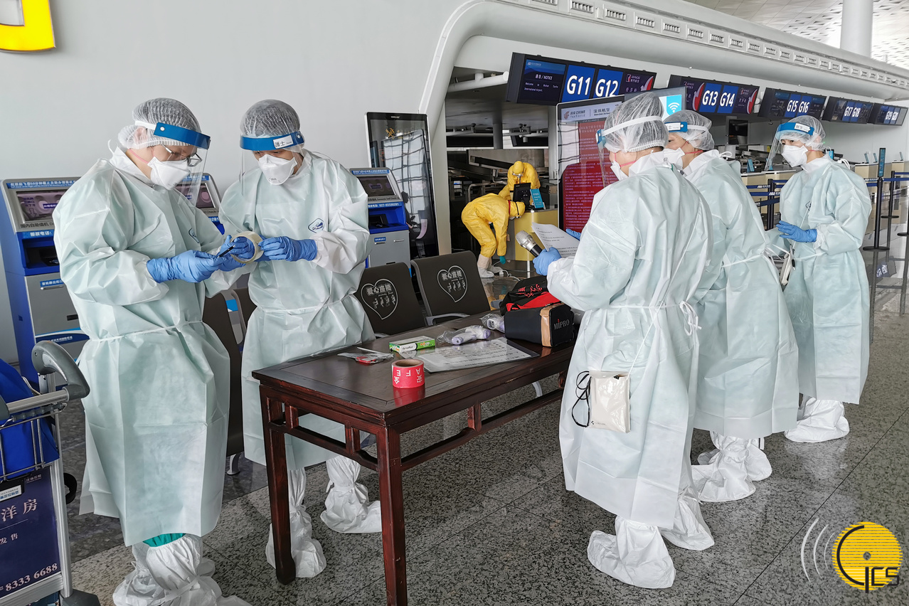 Macao Government personnel in protective gear check the condition of health of Macao residents intending to board the chartered flight leaving Hubei Province.