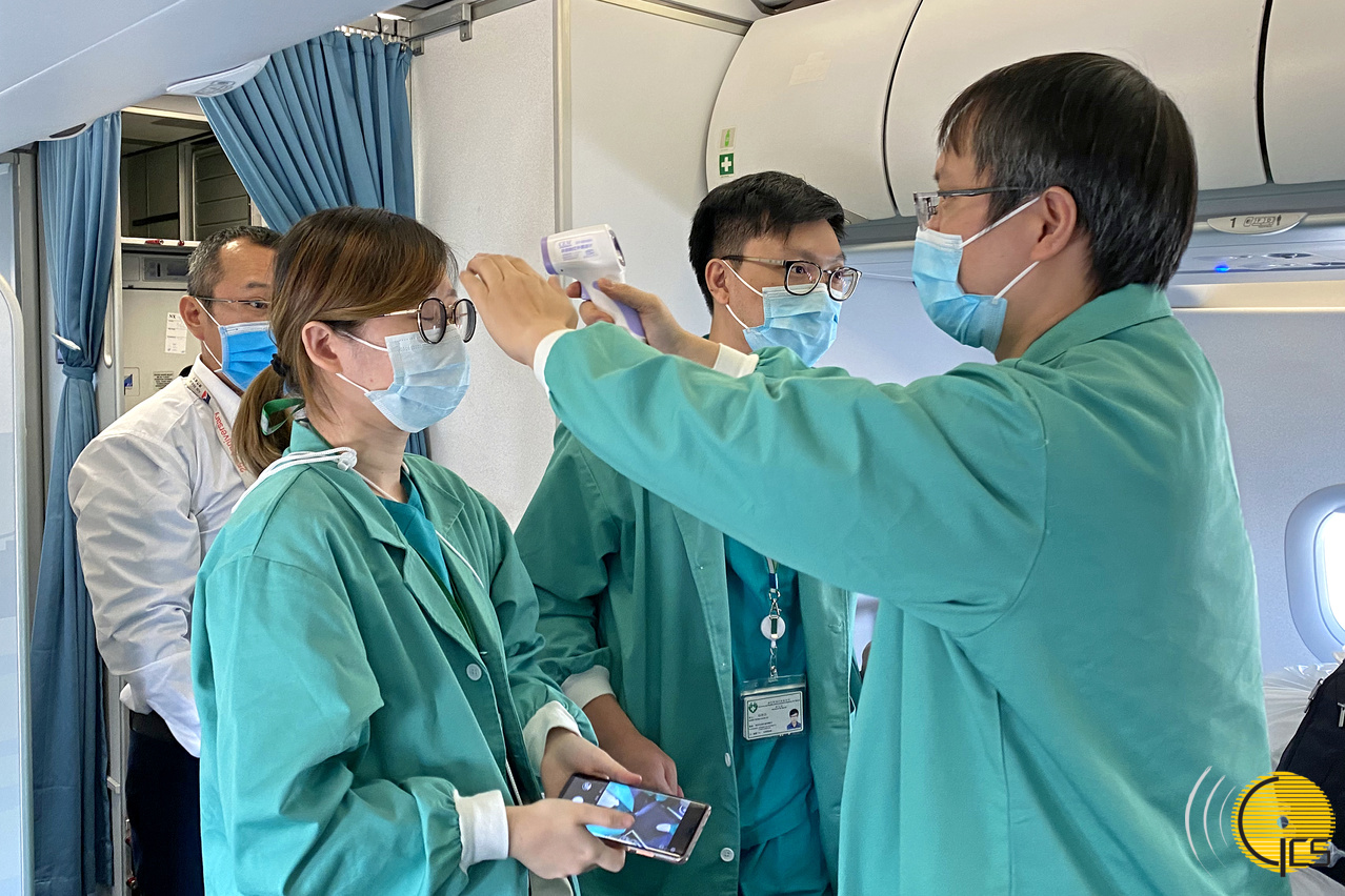 • Government personnel test body temperature before disembark the aircraft at Wuhan Tianhe International Airport, Hubei Province.