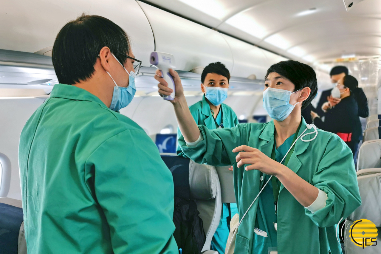 Government personnel test body temperature before disembark the aircraft at Wuhan Tianhe International Airport, Hubei Province.