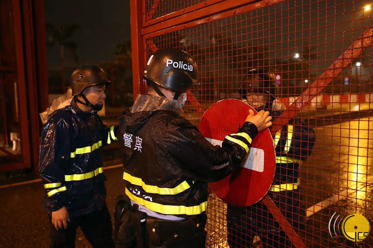 Public Security Police Force officers close Nobre de Carvalho Bridge, Sai Wan Bridge and Lotus Flower Bridge during Typhoon Signal No.8 or above.