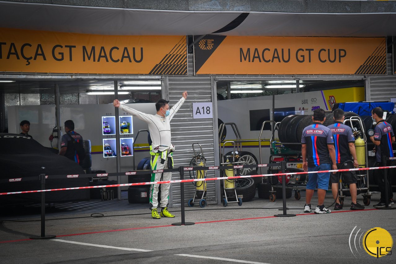 • A driver holds his arms aloft as he looks on from the pits near the home stretch of the famous 6.2 kilometre-long Guia Circuit.