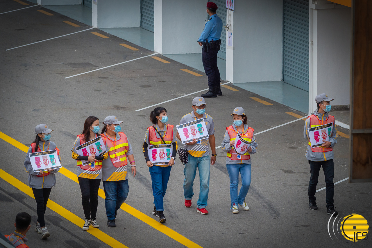 • Macau Grand Prix staff members carry signs that will explain to the crowds the access system for the various spectator zones.