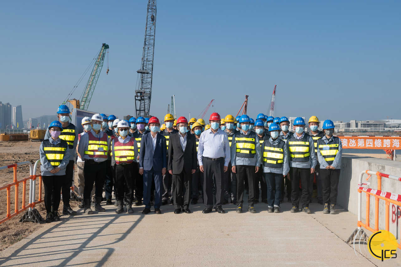 • The Chief Executive, Mr Ho Iat Seng, visits the New Urban Zone Area A site of the fourth Macao-Taipa cross-harbour bridge and poses for a group photograph with representatives of the company for the construction of the infrastructure.