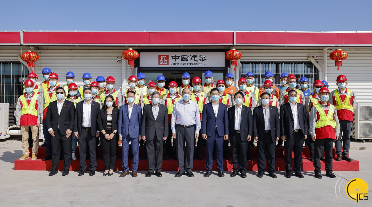 • The Chief Executive, Mr Ho Iat Seng, greets workers at the construction site of the Islands District Medical Complex.