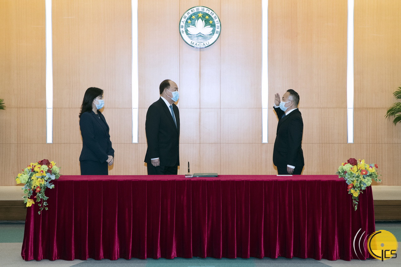 • The Chief Executive, Mr Ho Iat Seng, administers the swearing-in ceremony of the Director of the Policy Research and Regional Development Bureau, Mr Cheong Chok Man. The Chief-of-Office of the Chief Executive's Office, Ms Hoi Lai Fong, witnesses the ceremony.