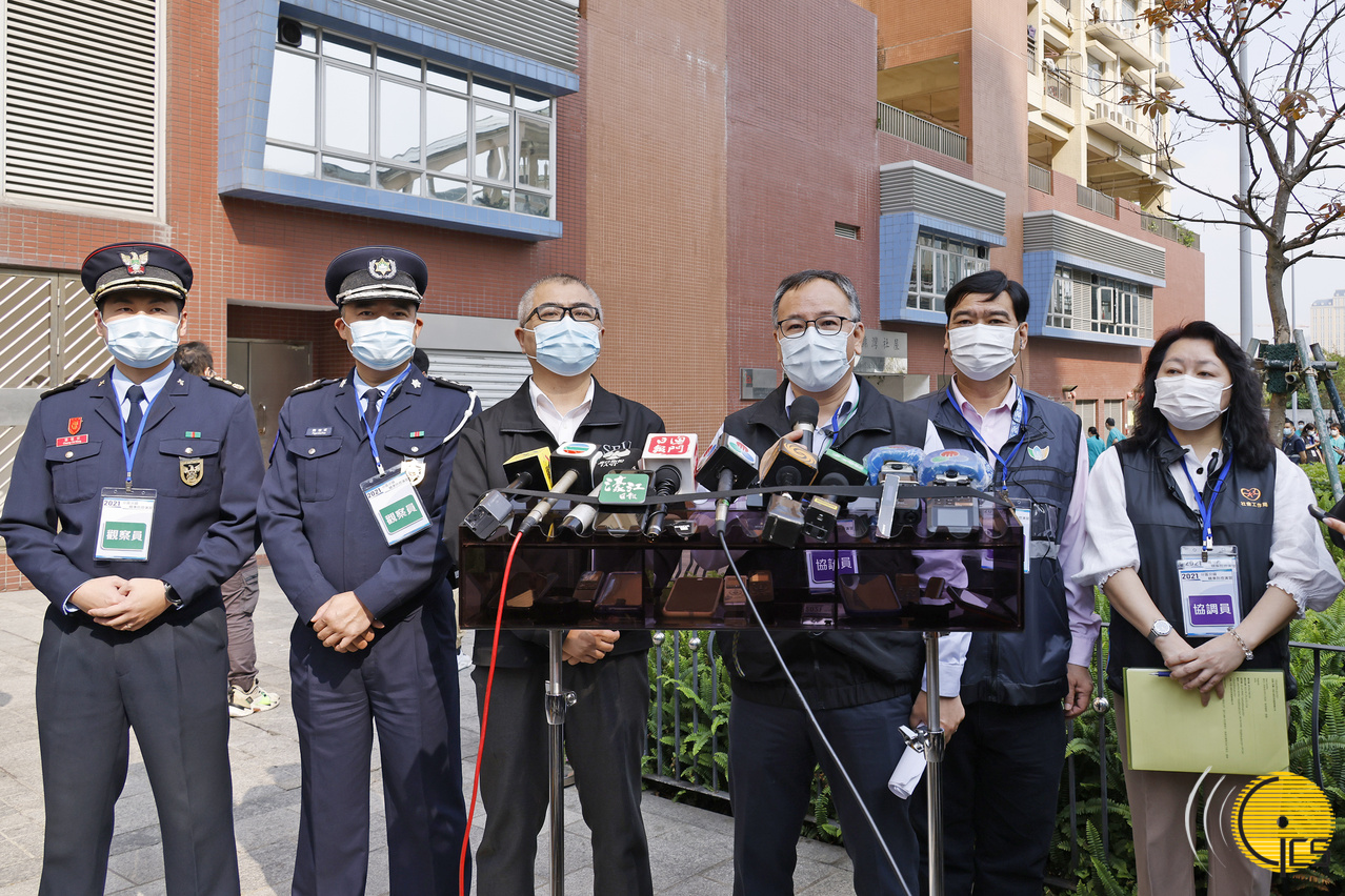 • Representative of the Novel Coronavirus Response and Coordination Centre, Mr Lei Wai Seng, and Assistant to Commissioner-General of the Unitary Police Service, Mr Wong Kin, brief the press on the drill to simulate the district- and risk-specific epidemic prevention plan.