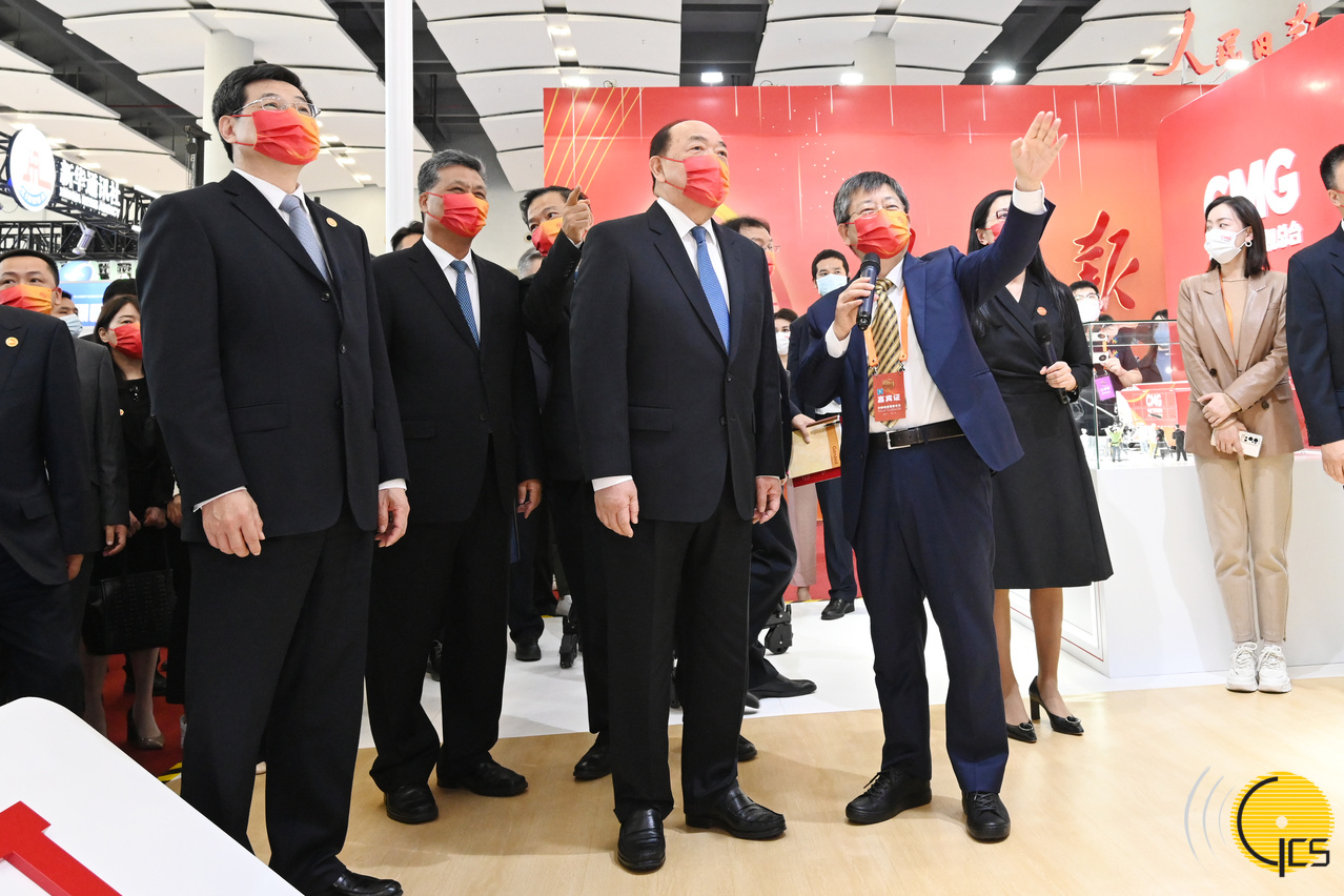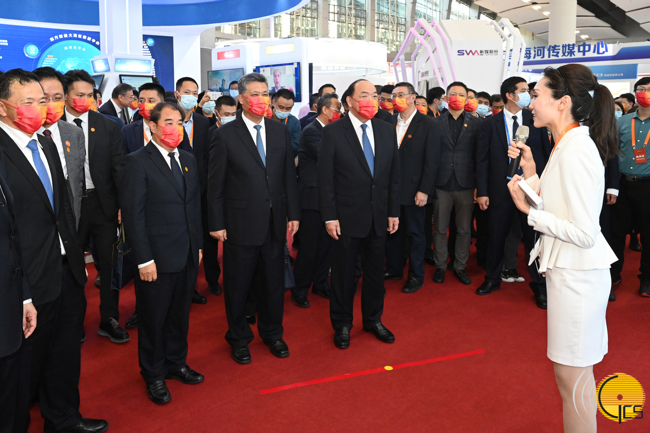 • Following the opening ceremony, the Chief Executive, Mr Ho Iat Seng, and guests visit the demonstration section for new technologies, new application and new types of business, at the 2021 China Internet Media Forum held in Guangzhou, Guangdong Province.
