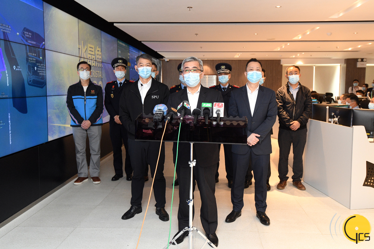 • The Secretary for Security and Commander of Joint Civil Protection Operations, Mr Wong Sio Chak, briefs reporters on details of the "Crystal Fish 2022" typhoon drill.