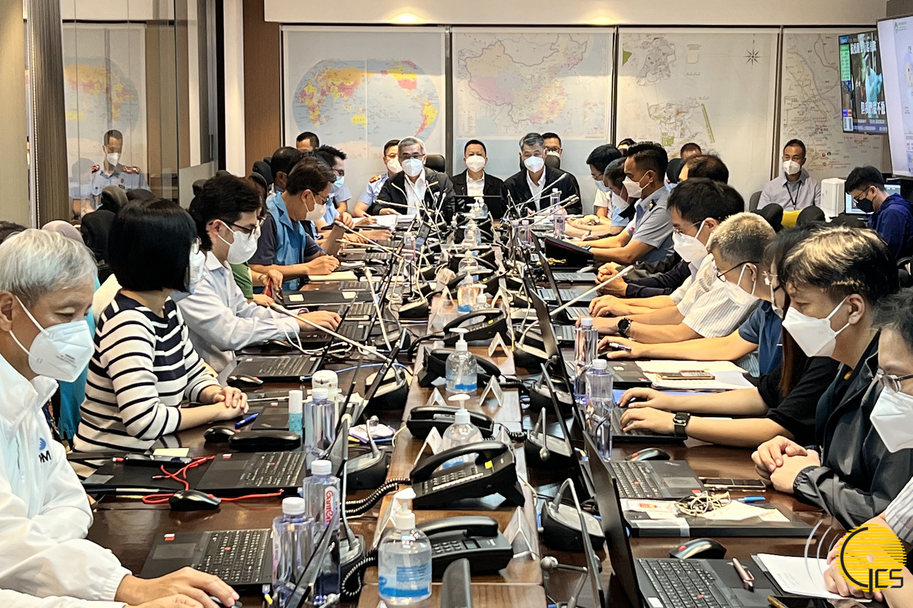 • The Secretary for Security and Commander of Joint Civil Protection Operations, Mr Wong Sio Chak, listens to a briefing at the Civil Protection Operations Centre regarding the city's response to passage of Typhoon Chaba. Secretary Wong directs utmost effort should be made to deal with typhoon-related conditions.
