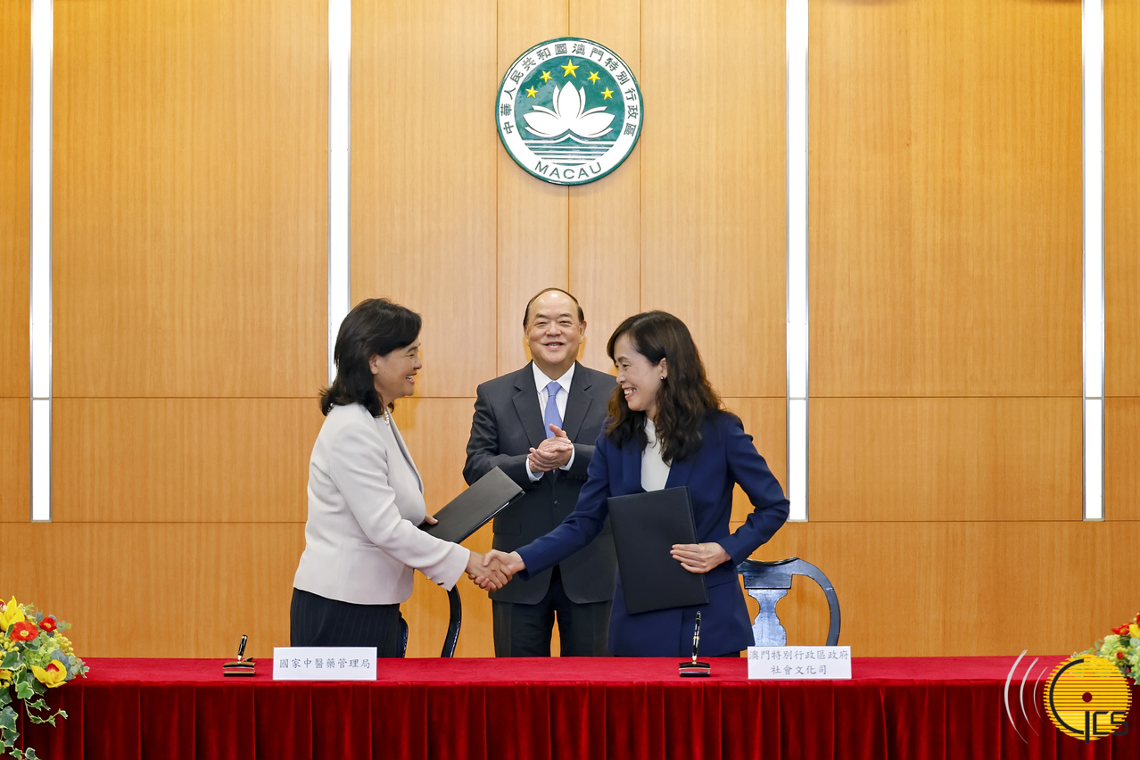 • The Secretary for Social Affairs and Culture, Ms Ao Ieong U, and the the Party Secretary of the National Administration of Traditional Chinese Medicine, Ms Yu Yanhong, exchange a copy of the Cooperation Agreement in the Area of Traditional Chinese Medicine between the Secretariat for Social Affairs and Culture of the Macao Special Administrative Region Government and the National Administration of Traditional Chinese Medicine.
