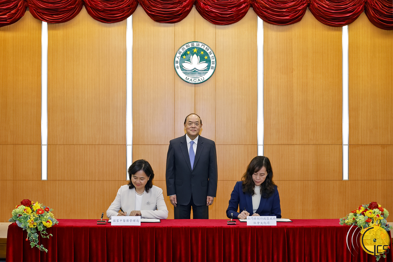 The Chief Executive, Mr Ho Iat Seng, witnesses the signing of the Cooperation Agreement in the Area of Traditional Chinese Medicine between the Secretariat for Social Affairs and Culture of the Macao Special Administrative Region Government and the National Administration of Traditional Chinese Medicine, during a ceremony held in Macao.