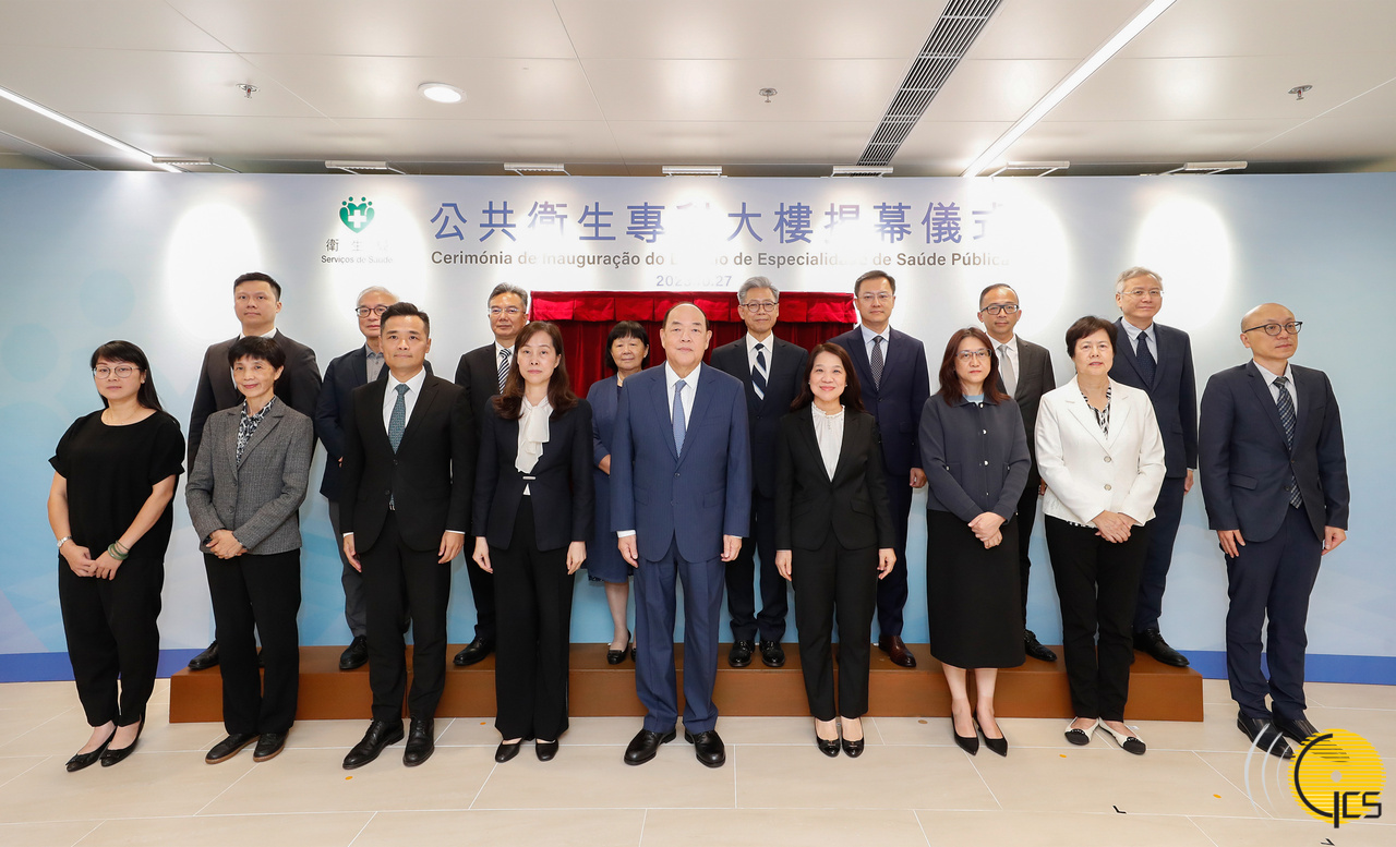 • The Chief Executive, Mr Ho Iat Seng, poses for a group photo at the unveiling ceremony of the Public Health Specialist Building.