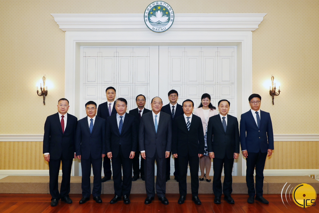 • The Chief Executive, Mr Ho Iat Seng, poses for a group photo with a delegation led by the Secretary of the CPC Zhuhai Committee and Secretary of the Work Committee of Hengqin of the Guangdong Provincial Committee, Mr Chen Yong.
