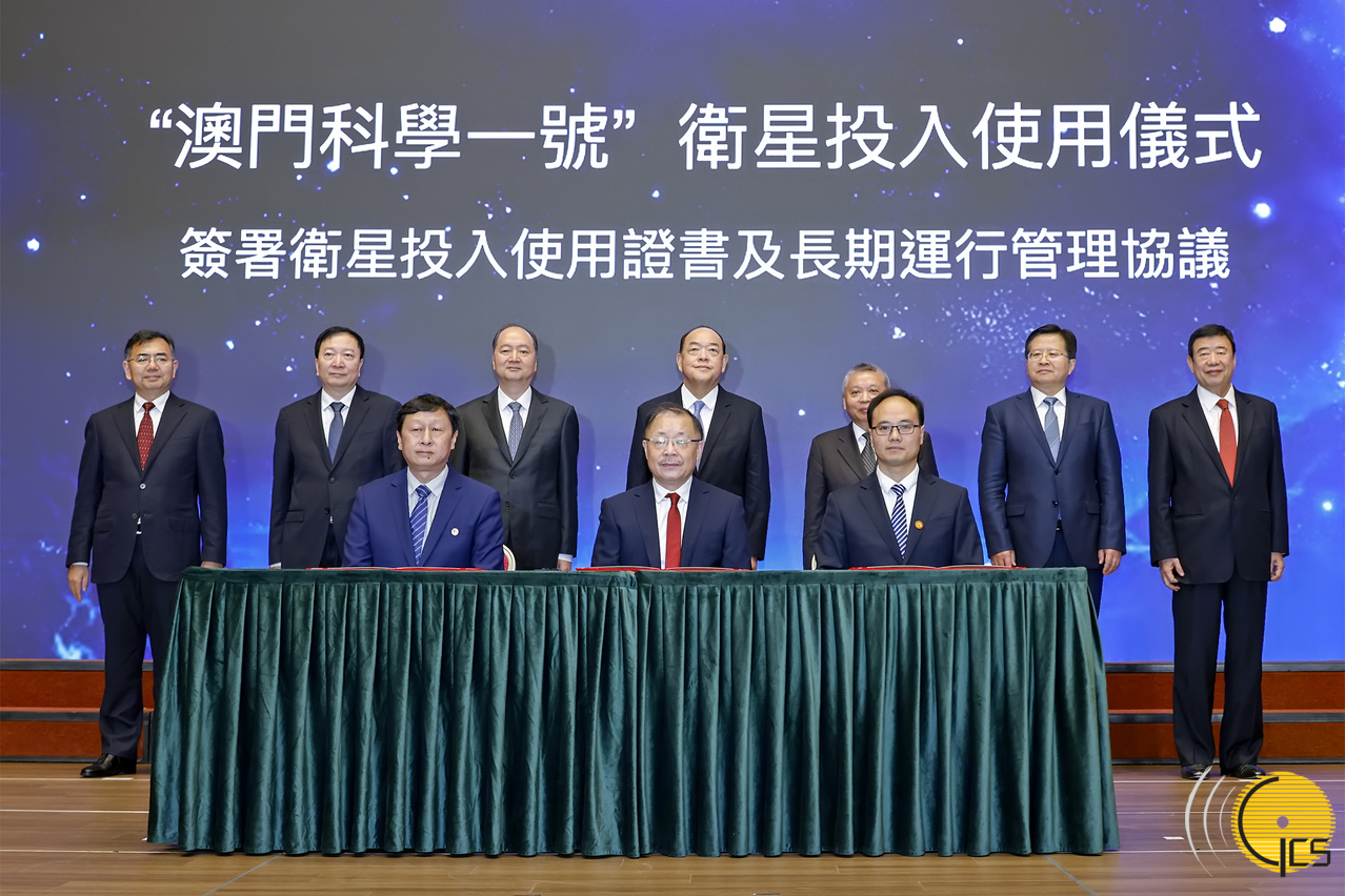 • The Chief Executive, Mr Ho Iat Seng; the Director of the Liaison Office of the Central People's Government in the Macao Special Administrative Region, Mr Zheng Xincong; and the Director of the National Space Administration of China, Mr Zhang Kejian, witness the signing of an agreement on the long-term management of the Macao Science 1 satellite (MSS-1)