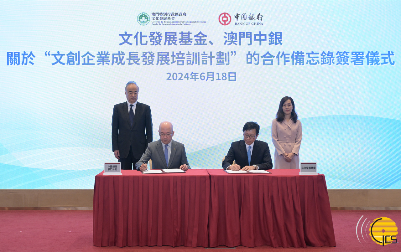 The Secretary for Social Affairs and Culture, Ms Ao Ieong U, witnesses the signing of a memorandum of understanding between the Cultural Development Fund and a financial institution regarding the "Cultural and Creative Enterprise Growth and Development Training Program".