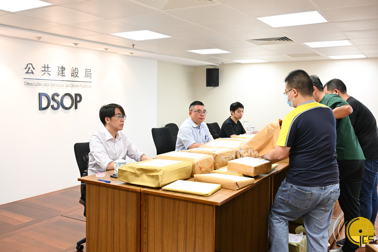 • Officials of the Public Works Bureau open tender documents for the construction project of Government office buildings in Lot 25 of the Outer Harbour Reclamation Area (NAPE).